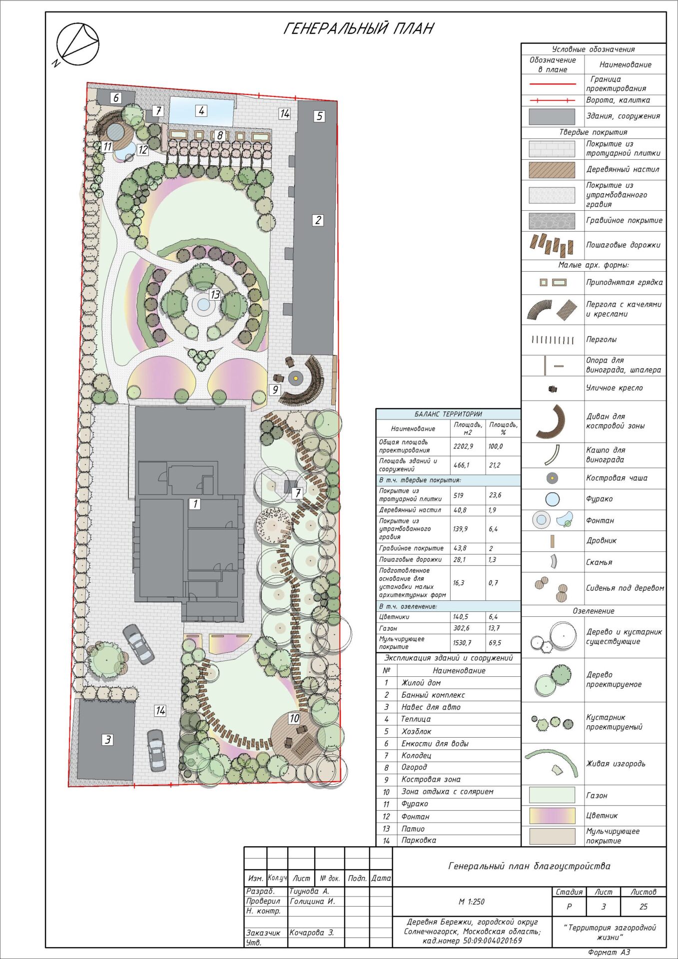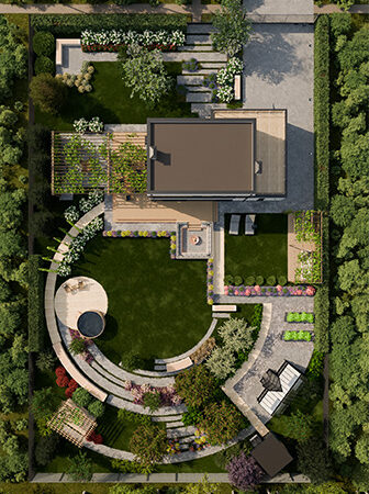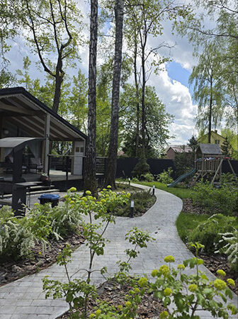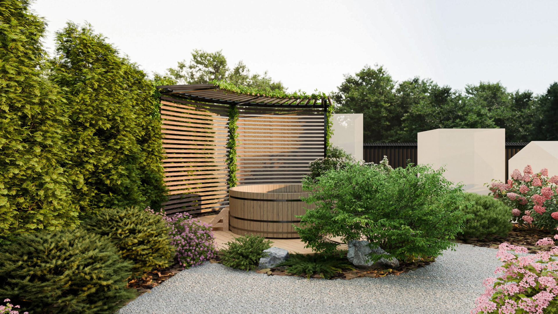 Затейливые гравийные дорожки приглашают на прогулку глубже в сад, к месту уединения с расслабляющей купелью фурако и причудливым каменным фонтаном. Эти уголки укрыты от посторонних глаз живыми ширмами из растений и обрамлены изумрудными лужайками. Дальше путь лежит под сенью пергол, увитых актинидией Коломикта, к функциональной хозяйственной зоне в самом отдаленном уголке сада. Здесь, за зелеными кулисами, расположились аккуратный огород с высокими грядками и плодовые кустарники, а в юго-восточной части – теплица, колодец и резервуары для воды.