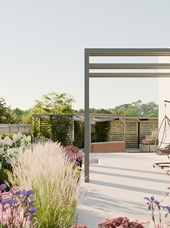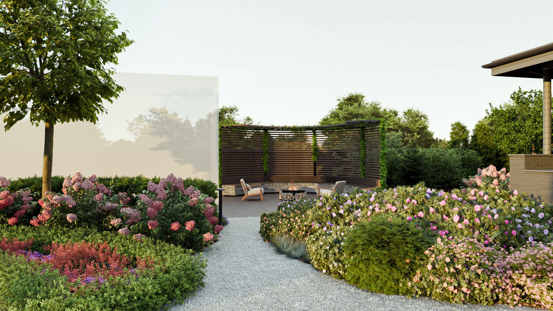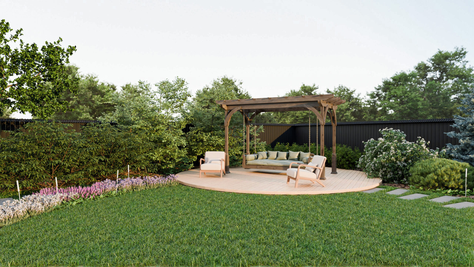 Справа от патио притягивает уютом костровая зона с полукруглой перголой и аккуратным дровником. Вдоль южной границы органично вписались банный комплекс, повторяющий стиль основного дома, и хозяйственный блок.