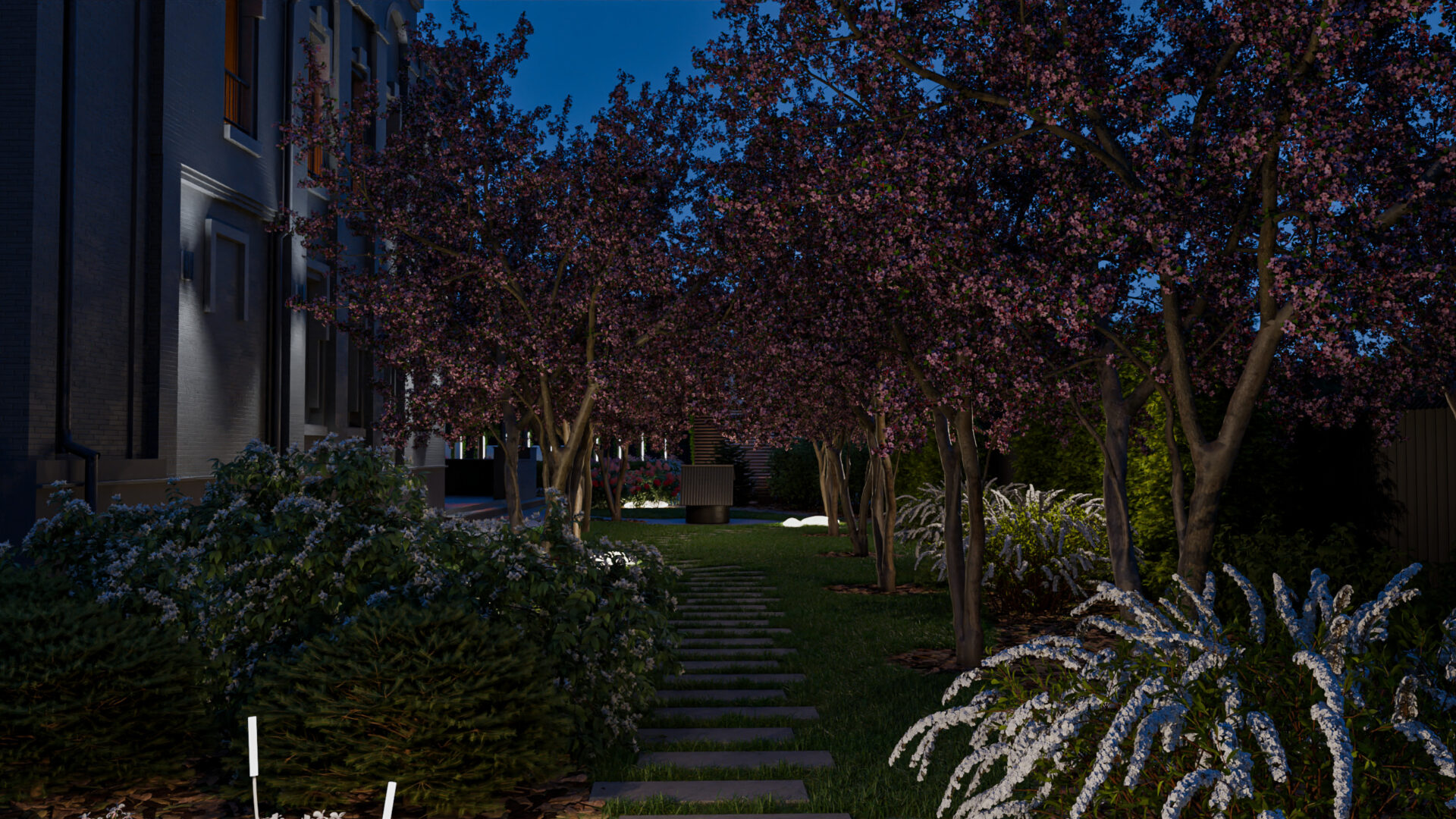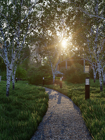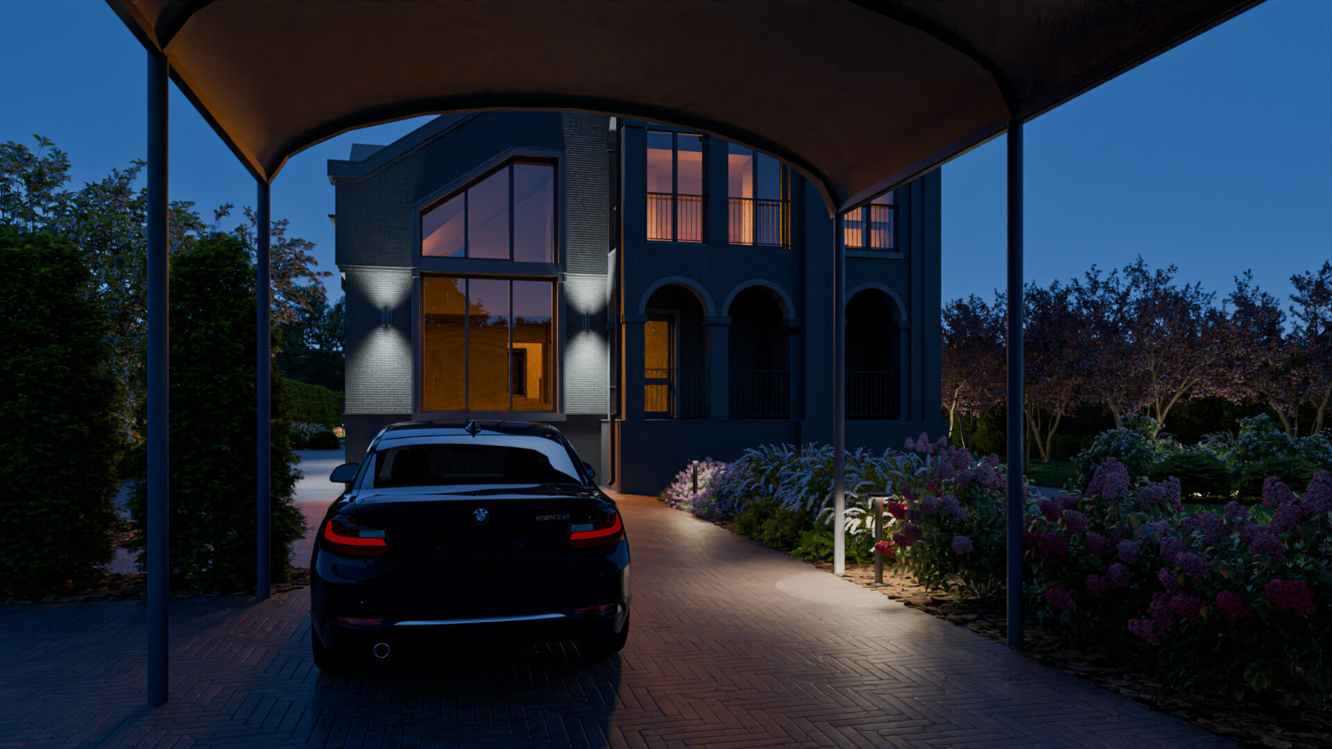 С наступлением сумерек сад преображается игрой света. Изящные болларды освещают основные пути, небольшие сферические светильники отмечают парковку. Теплое сияние LED-лент подчеркивает линии настилов и пергол. Ландшафтные прожекторы и светильники-камни мастерски выделяют фактуру растений и рельефа, а гирлянды, вплетенные в полукруглые перголы, и подсвеченные фонтаны создают поистине волшебную атмосферу вечерней усадьбы