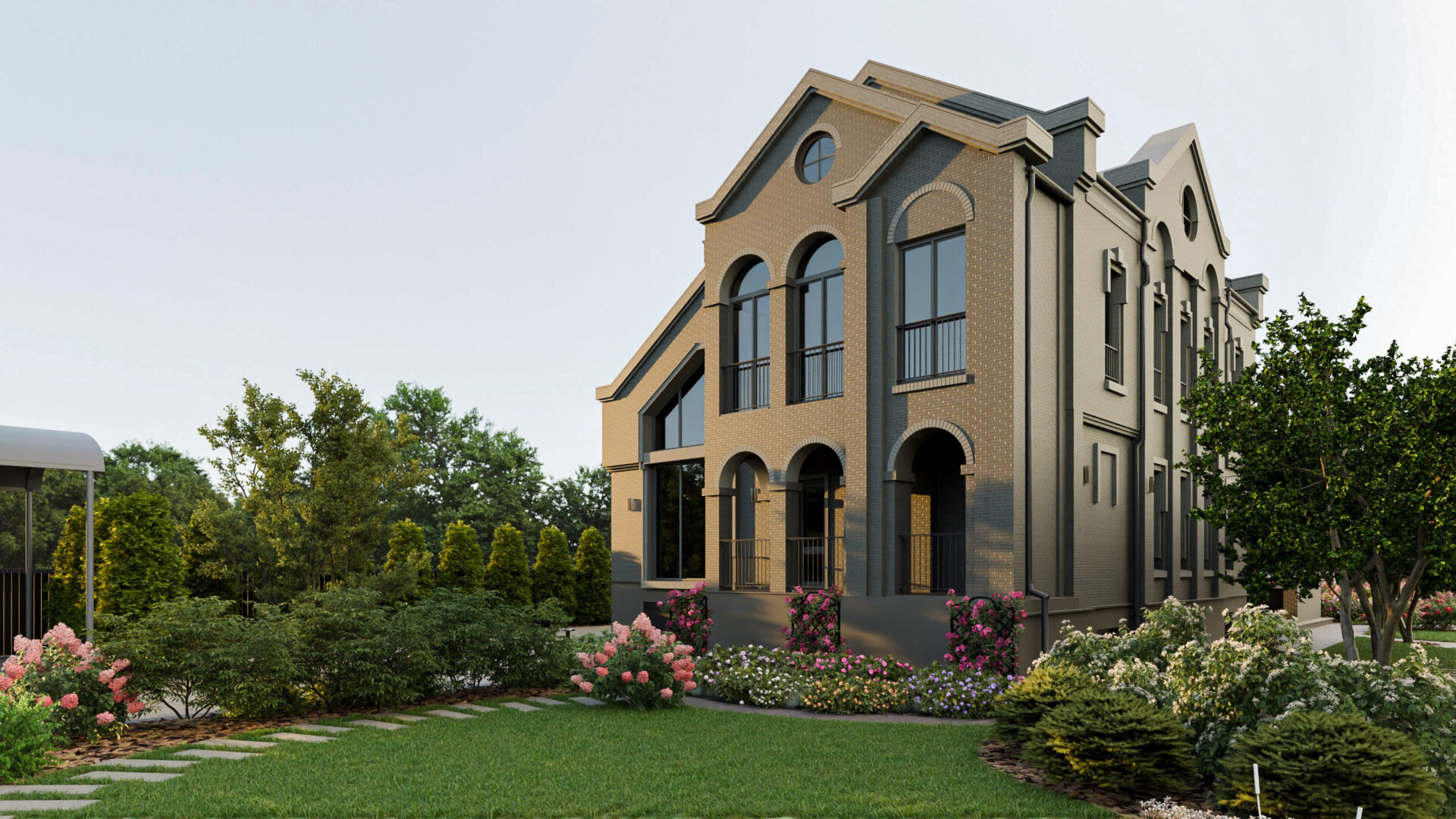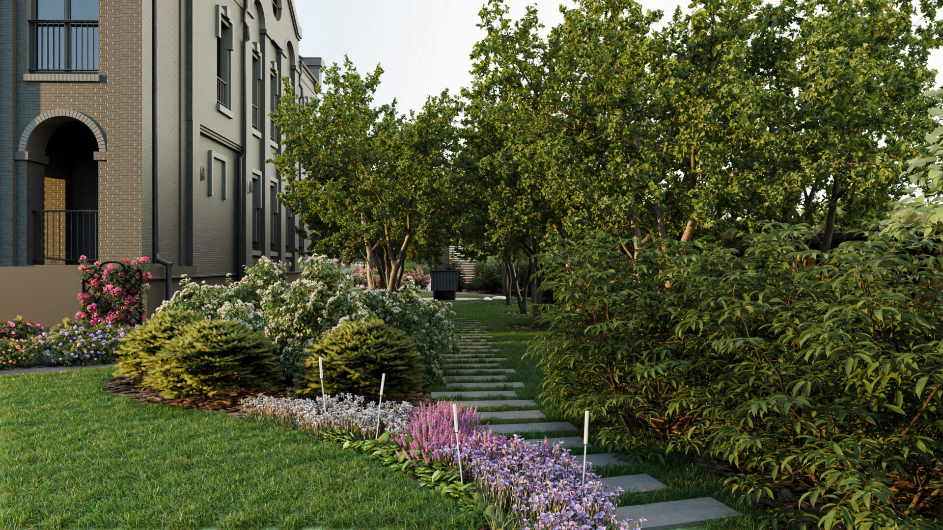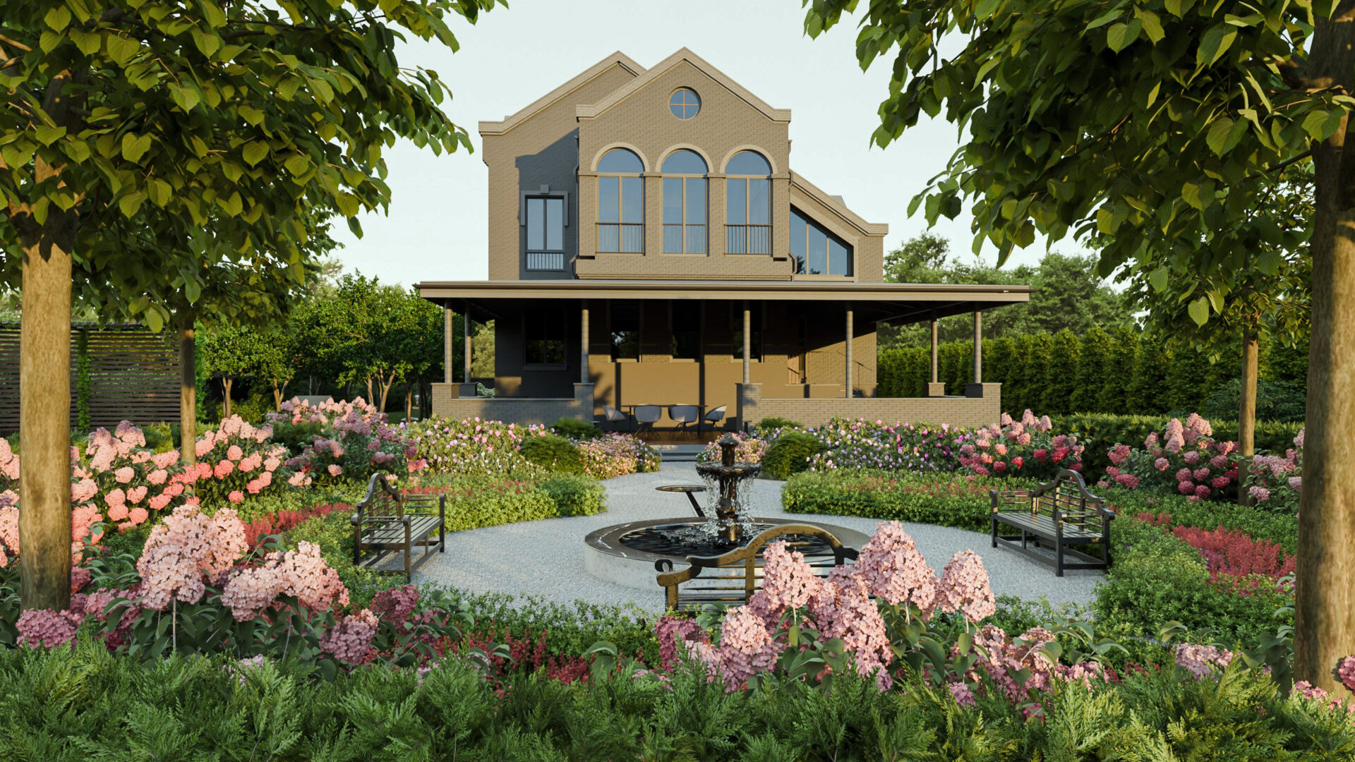 Огибая дом по правой стороне, где стройными рядами высажены плодовые деревья, та же гравийная тропа приводит в совершенно иной мир заднего двора. За домом раскрывается изысканный сад-патио, вдохновленный элегантностью французских регулярных садов. В его сердце – каменный фонтан, окруженный скамьями для созерцания. Геометричные формы подчеркнуты стрижеными декоративными кустарниками (гортензии, кизильник), штамбовыми липами, строгими массивами неприхотливых многолетников и еще одним нежным розарием.