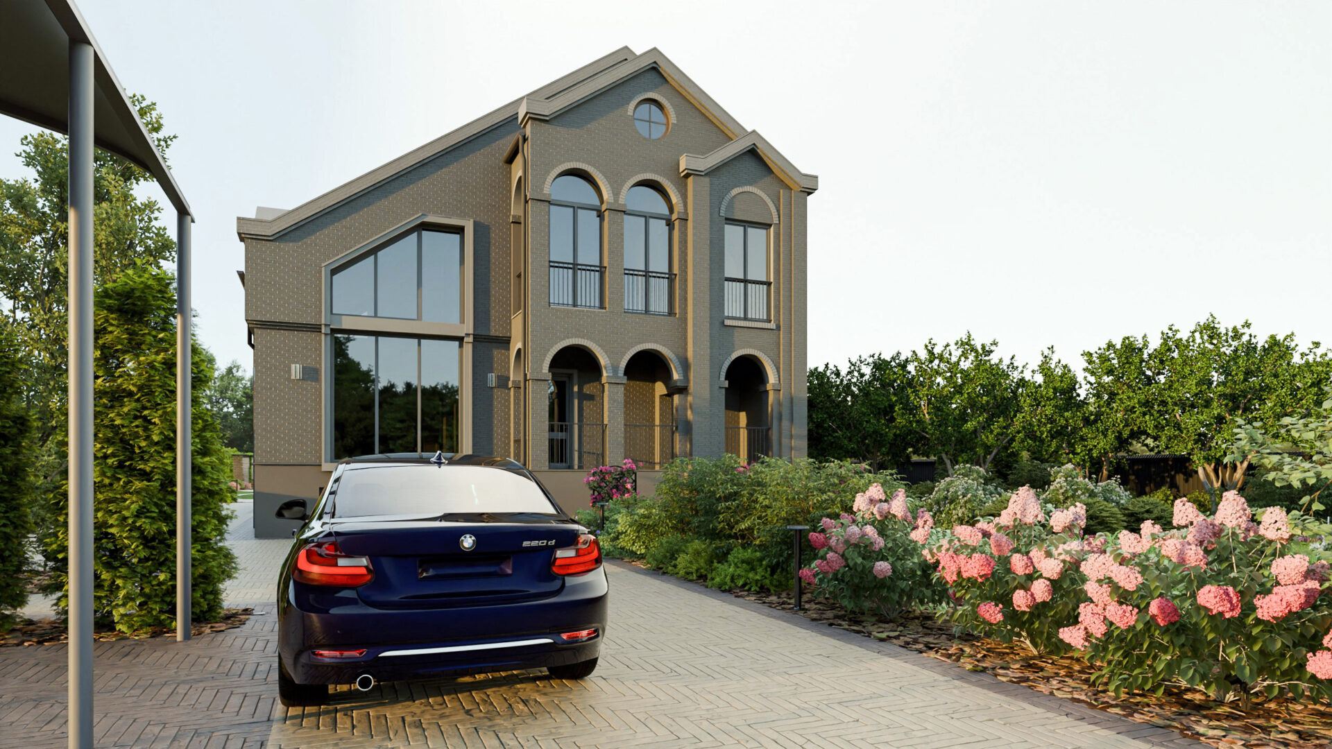 Войдя с северной стороны, гость попадает на аккуратную парковку, укрытую под навесом и вымощенную плиткой, плавно ведущей вдоль фасада дома. Здесь же, в тени величественной ирги Ламарка, приглашают отдохнуть деревянные круглые сиденья. Справа от парковки открывается взгляду сад в природном стиле – царство хвойных и лиственных деревьев, в глубине которого, словно тайный уголок, укрыта солнечная зона отдыха с шезлонгами. Отсюда извилистые пошаговые дорожки ведут мимо роскошного розария к парадному крыльцу дома.