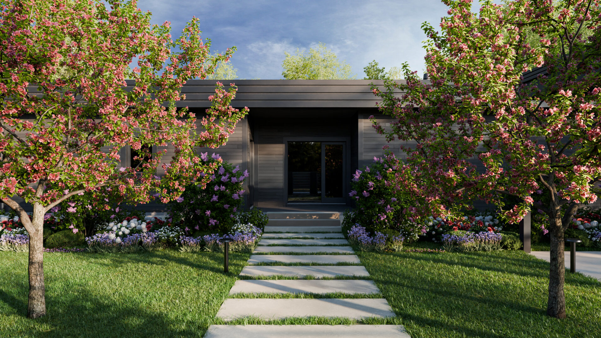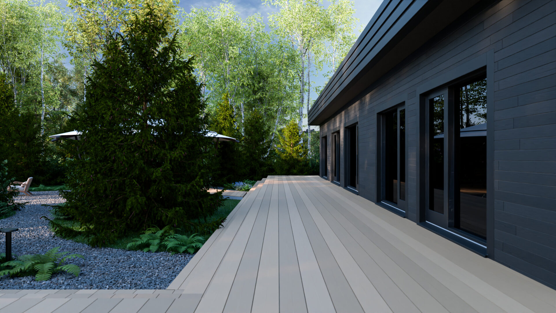 Одноэтажный дом, спроектированный для круглогодичного комфорта, теплом встречает своих обитателей. Рядом, словно младший брат, расположился уютный гостевой дом, соединенный с основным пространством единой террасой