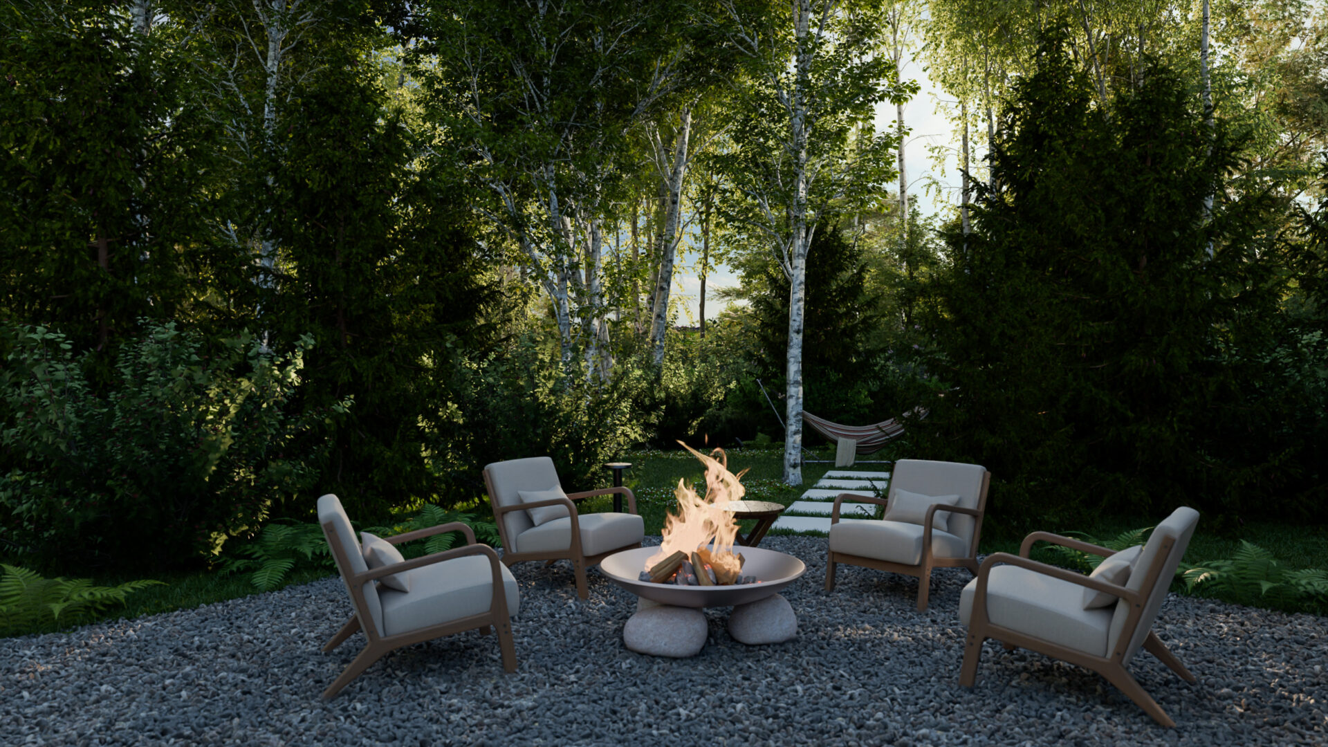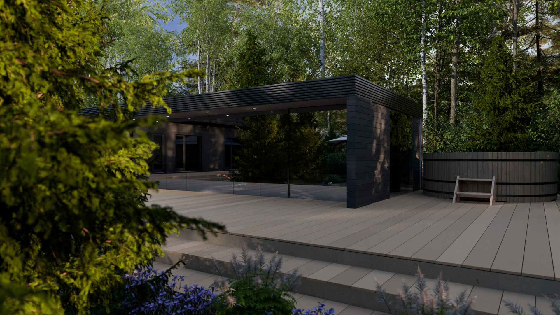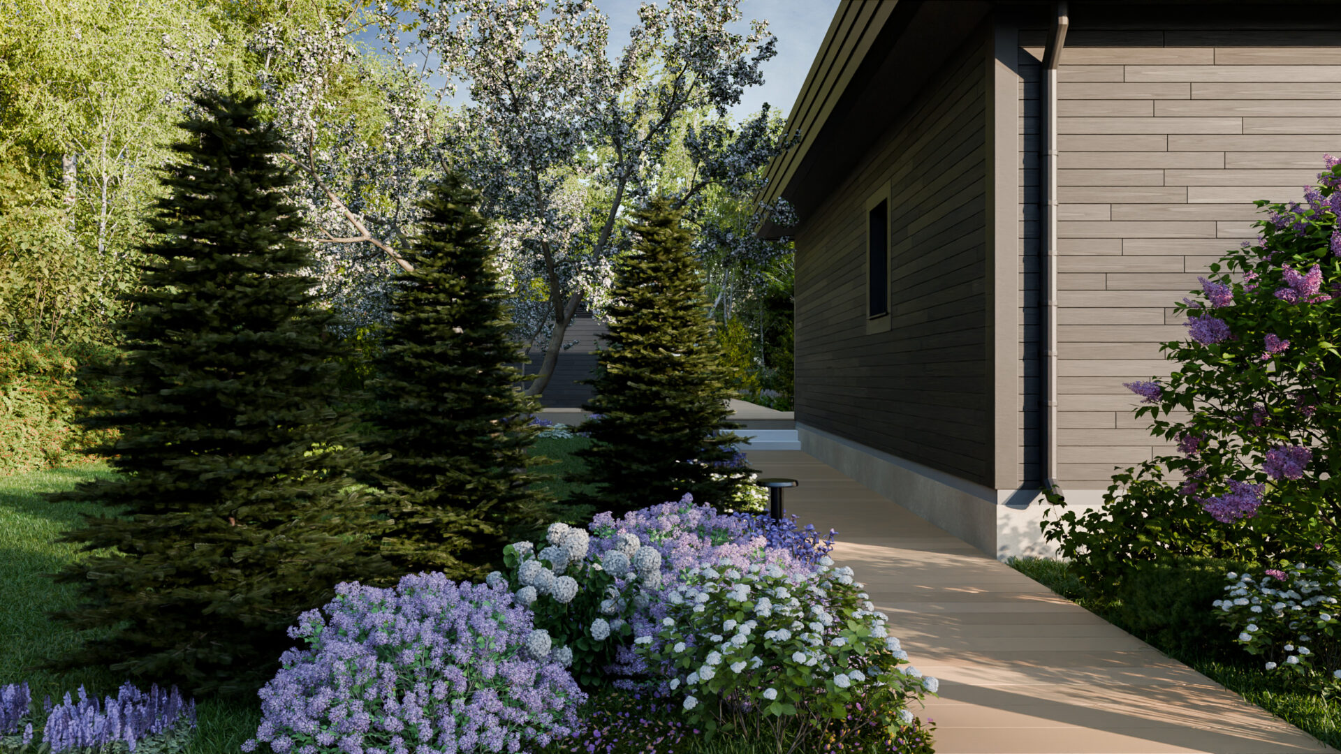 «В тишине леса» – это сад, где рельеф и бурная лесная растительность стали основой для гармонии, где каждая зона продумана для общения или уединения, а вечерний свет ткет кружево уюта над семейным гнездом в лесах Подмосковья.