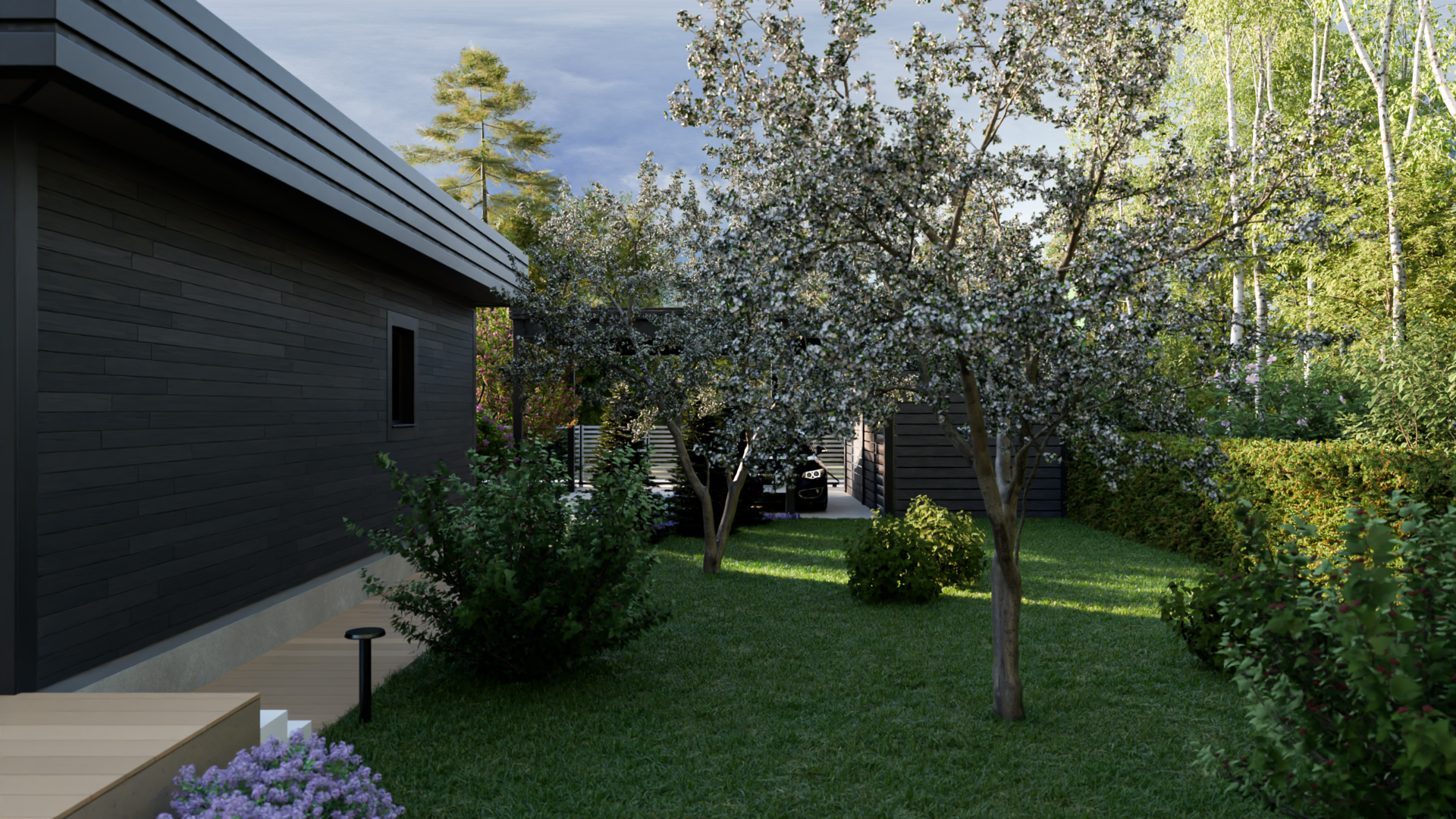 Юго-западный фасад встречает двумя элегантными экопарковками под защитными навесами – для хозяев и их друзей. Функциональность здесь гармонична: аккуратные хозблоки фланкируют зону, а вместительный гараж готов принять авто. Отсюда же начинается путь к главному дому – центру семейной жизни.