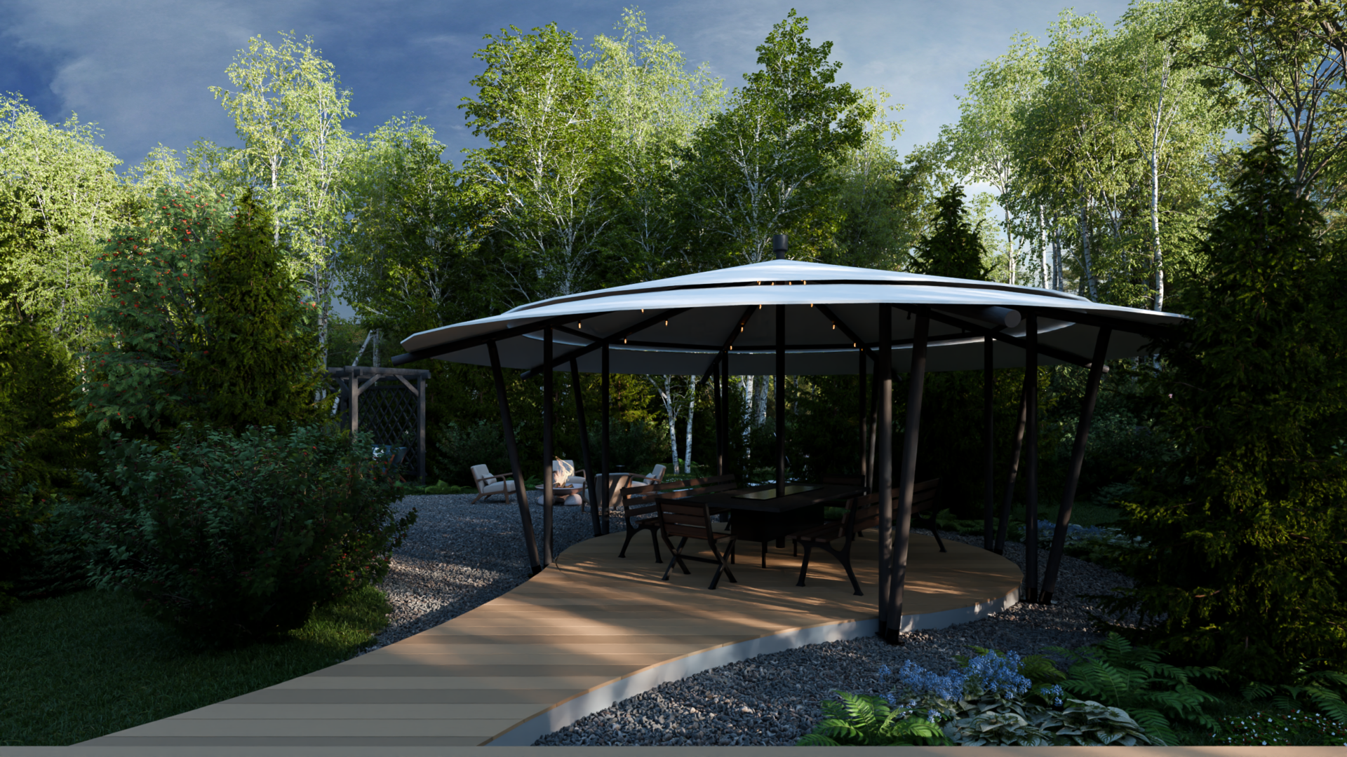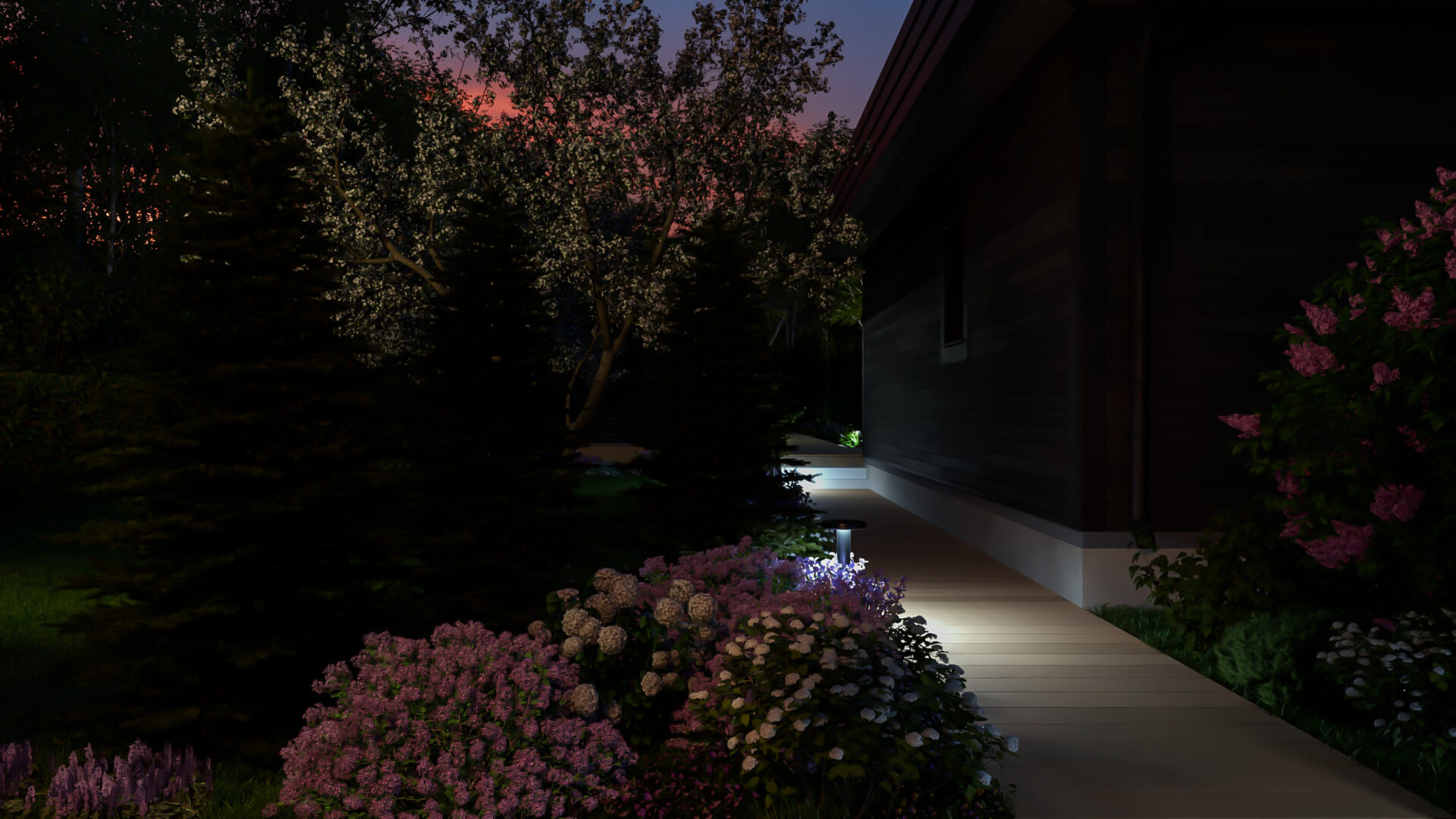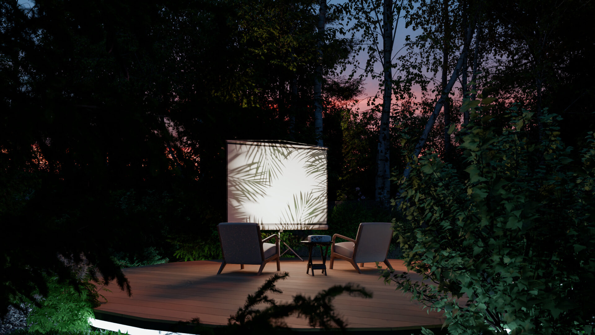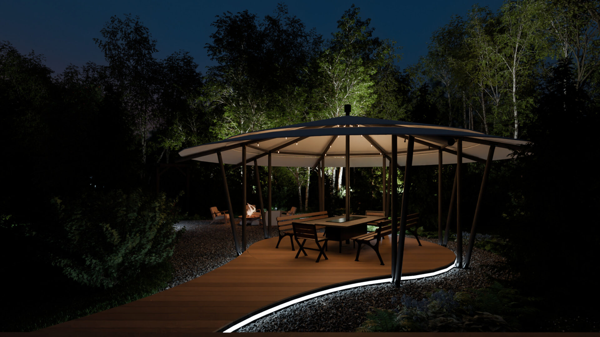 * Теплое сияние LED-лент подсвечивает площадки барбекю и кинотеатра, создавая сцену для вечерних сцен.