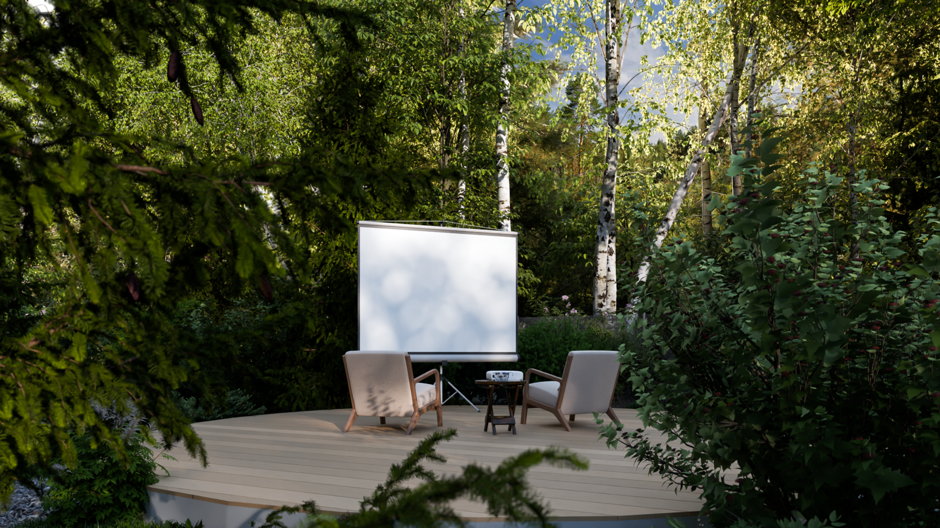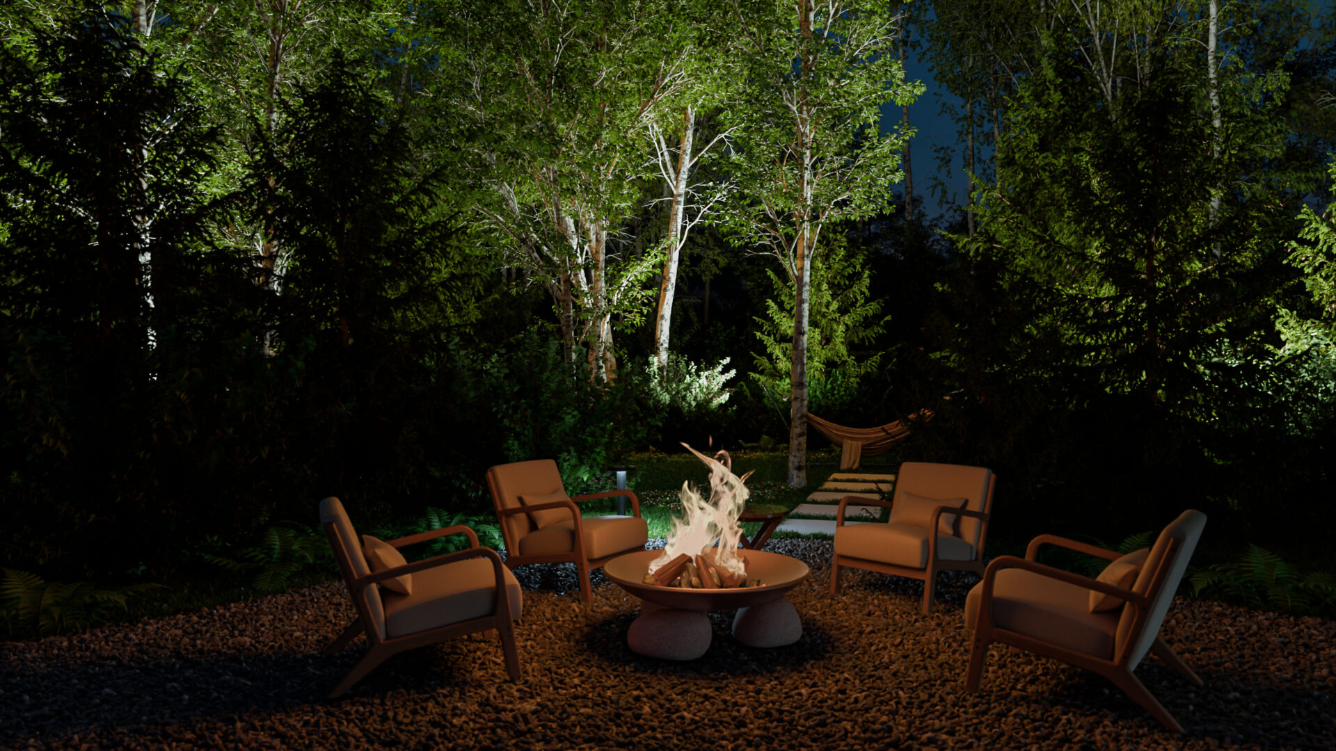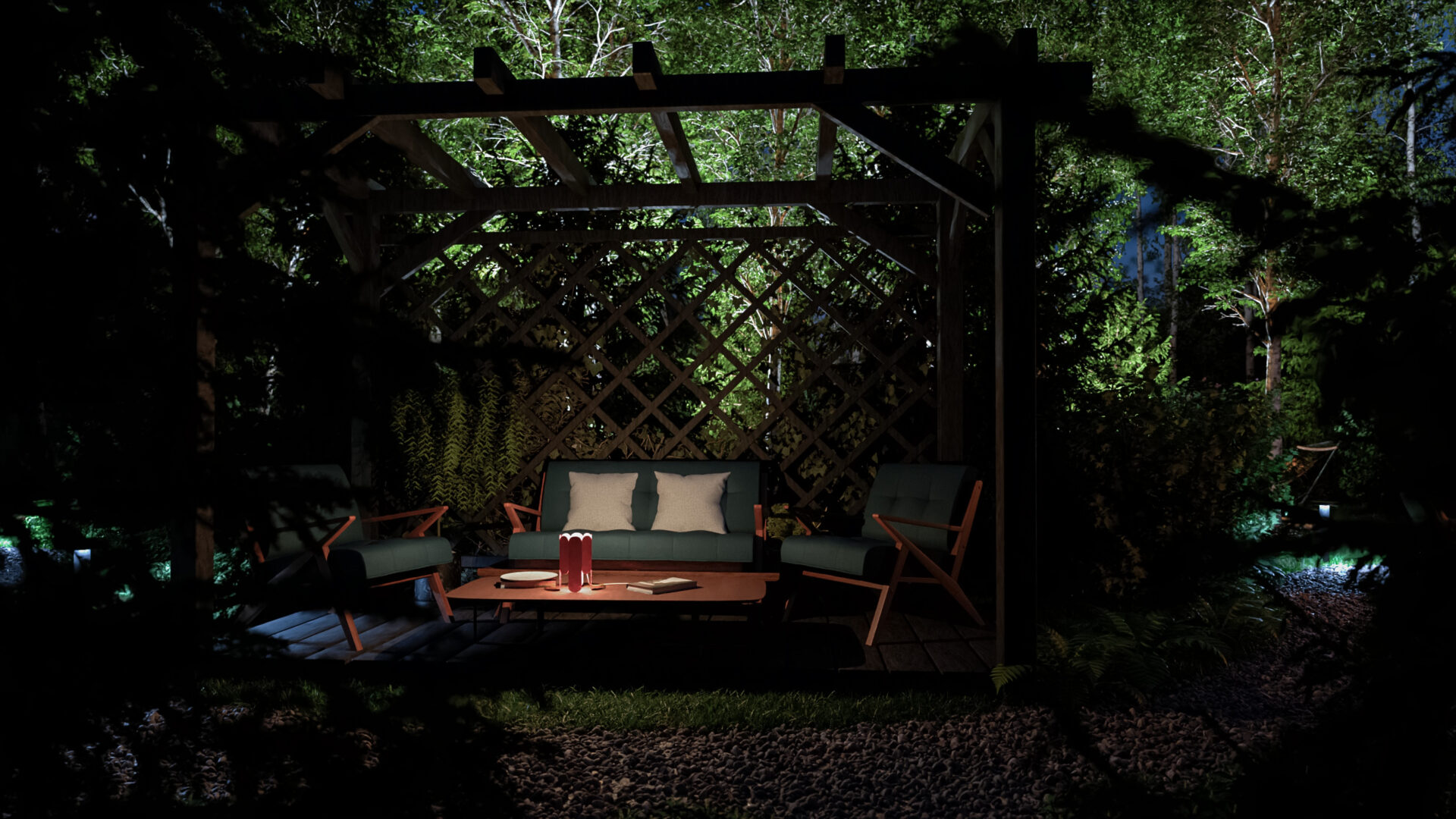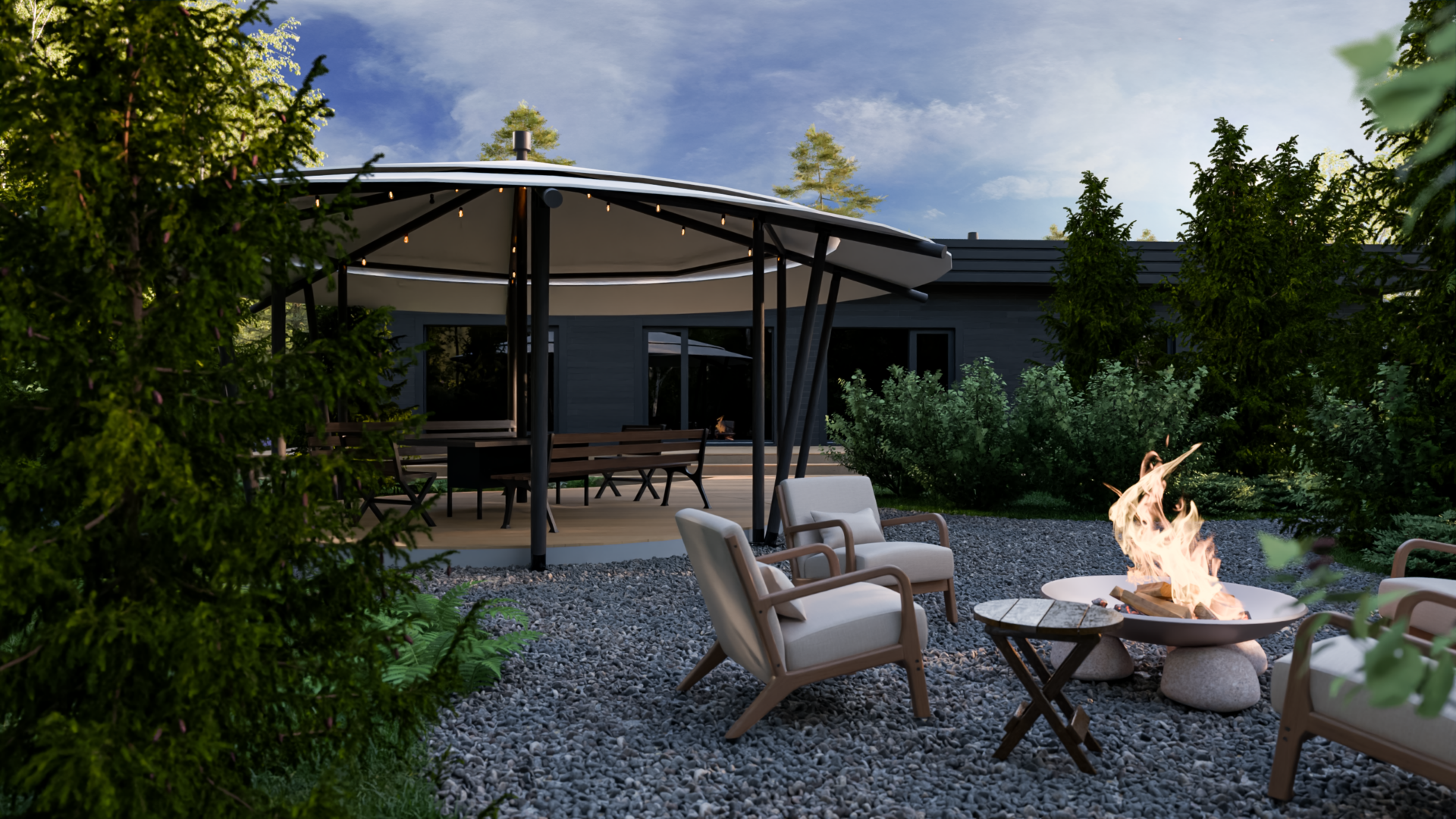 * Теплое сияние LED-лент подсвечивает площадки барбекю и кинотеатра, создавая сцену для вечерних сцен.
