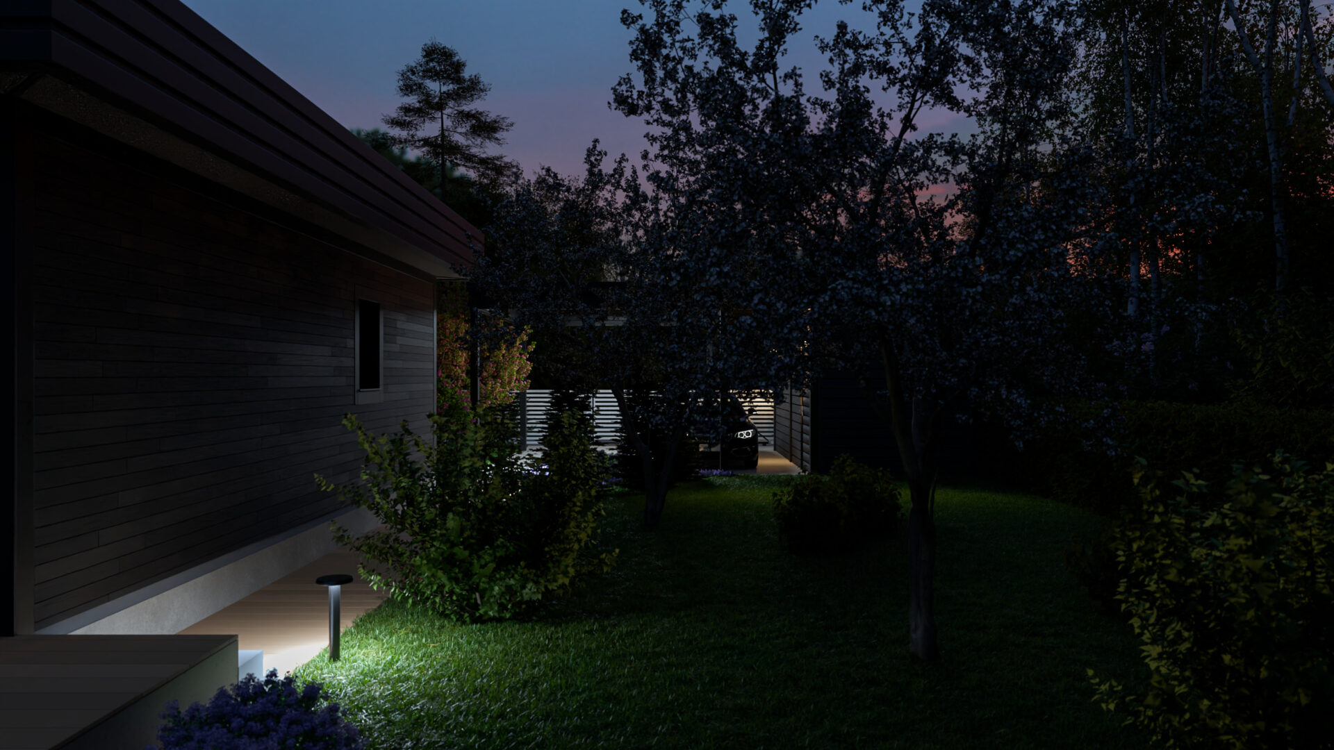 * Мягкие настенные фонари на гостевом доме и хозблоках рисуют теплые акценты в темноте.